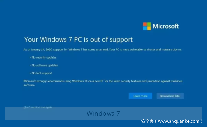 3)官方不再进行安全更新或修复,这也是最值得注意的一点,Windows 7系统失去了对抗安全威胁的武器和铠甲。