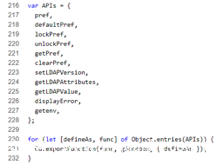 然而,该文件并不具备XPCOM的访问权限,因此我们无法在其中直接包含XPCOM代码。这是因为首选项文件使用特定的一组函数来执行,这些函数包含在prefcalls.js中。