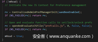 然而在版本62之后,Firefox默认将AutoConfig放在沙箱中,避免攻击者使用危险的XPCOM功能。默认情况下。只有桌面版Firefox(我们尚未分析移动版)启用了沙箱,因此ESR及Nightly版中并没有沙箱化AutoConfig。Firefox对AutoConfig的处理过程在如下代码中: