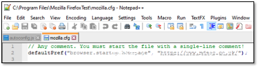 默认配置中的恶意代码应当存放在AutoConfig文件中(如mozilla.cfg文件),放在Firefox安装目录中。首选项文件(autoconfig.js)应当放在defaults/pref目录中,在AutoConfig文件中引用。