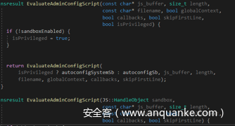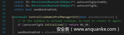 CentralizedAdminPrefManagerInit()函数定义位于nsJSConfigTriggers.cpp中,该函数中会将sandboxEnabled变量的值设为传入的参数值。随后EvaluateAdminConfigScript()函数会使用该变量来在autoconfigSystemSb和autoconfigSb之间切换JavaScript上下文: