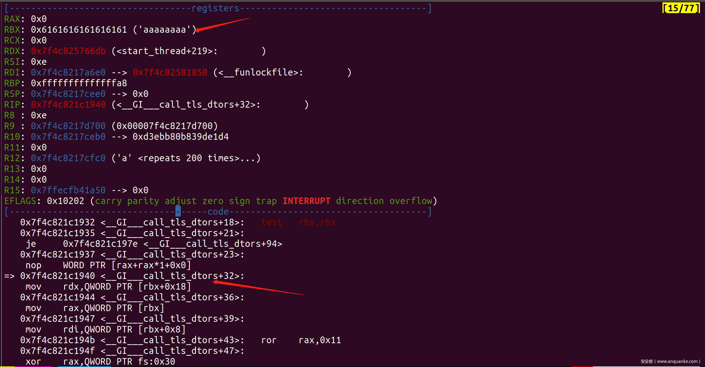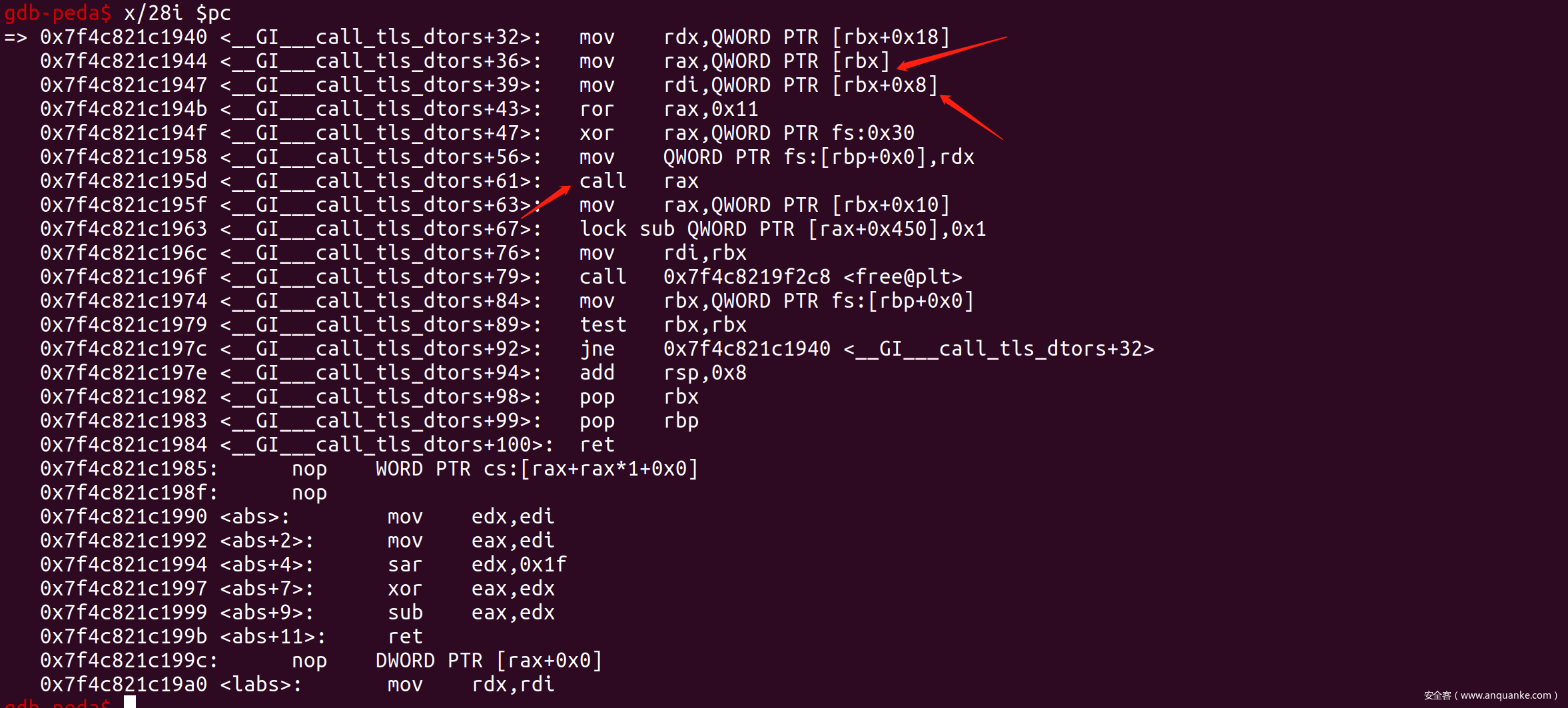 在最终调用func之前,还有一次ror rax,0x11和xor rax, gs[0x30],需要leak出tls的pointer_guard成员。