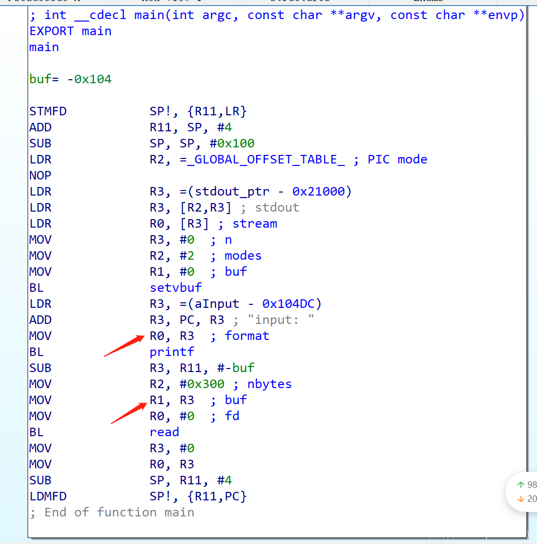通过测试发现栈上残存了一些stdout指针,不过因为其位置位于printf字符串寻址的低地址处,无法控制,修改printf返回地址或者main_func返回地址的低字节到start函数,在__libc_start_main调用的时候会大幅度减栈,使得这些stdout指针转移到新的printf函数栈帧高地址处,从而可以覆写其fileno为2来重新输出内容。