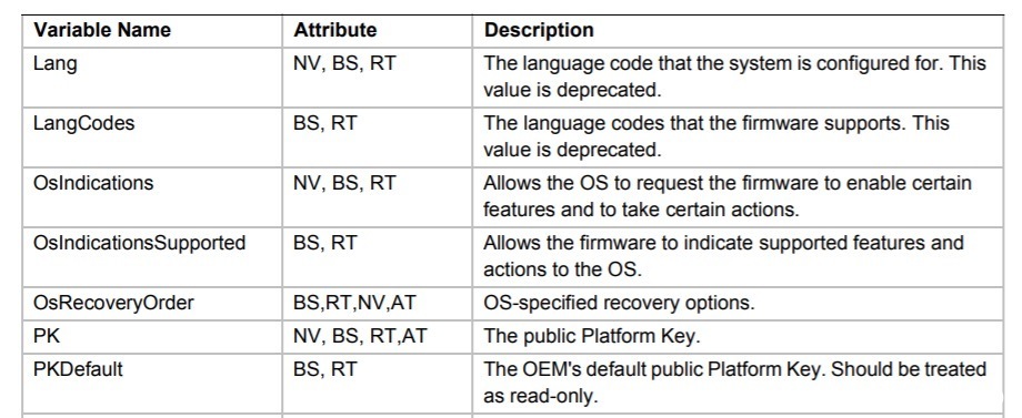从上面的截图中可以看出,每个变量都是由一个人类可读的名称和一些属性组成。这些属性决定了变量是否是易失性的(NV),是否可以在运行时访问(BS,RT),以及对变量的访问是否应进行身份验证(AT)。虽然没有明文规定,但每个变量也被链接到一个唯一的厂商GUID,以免出现潜在的名称冲突。