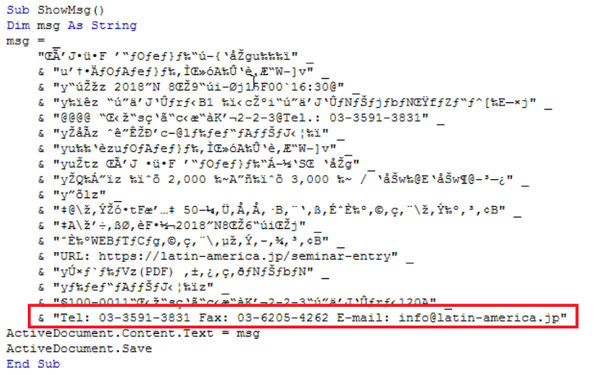 下图显示了诱饵文档的宏功能。在此函数的底部,我们可以看到可读文本。因此,对拉丁美洲问题感兴趣的人可能是此活动的目标。