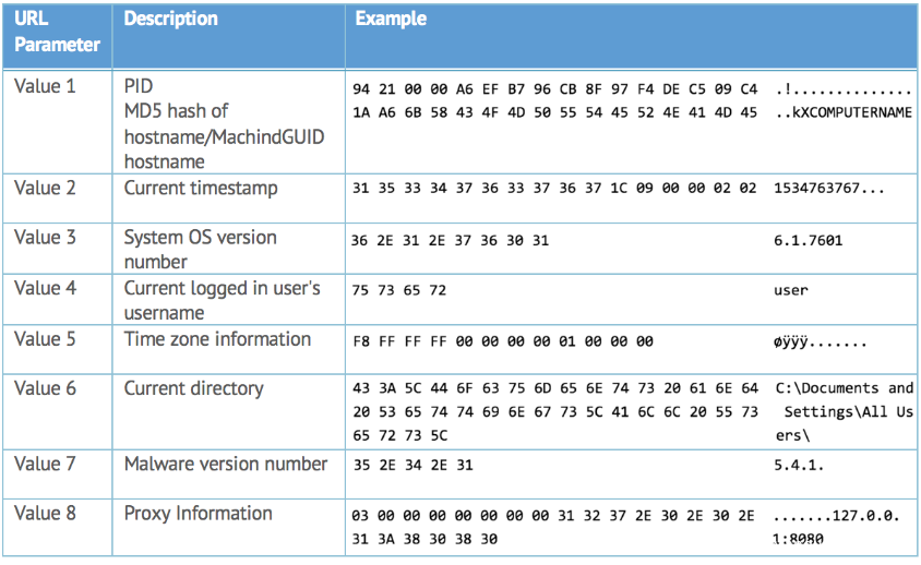 Default Default f12df6984bb65d18e2561bd017df29ee1cf946efa5e510802005aeee9035dd53在此示例中,hxxp [:] // 151.106.53 [.] 147 / VxQG的MD5哈希值为f613846eb5bed227ec1a5f8df7e678d0。当恶意软件与此URL交互时,将选择bdc4b9f5af9868e028dd0adc10099a4e6656e9f0ad12b2e75a30f5ca0e34489d作为Blowfish密钥。如果URL的MD5哈希值与列出的任何哈希值不匹配,则将使用默认密钥f12df6984bb65d18e2561bd017df29ee1cf946efa5e510802005aeee9035dd53。与以往版本的另一个差异是在C2通信期间在URL查询值中添加了编码的代理信息。下图显示了在较新版本中从后门发送到C2服务器的参数。这些参数是通过POST请求发送的。