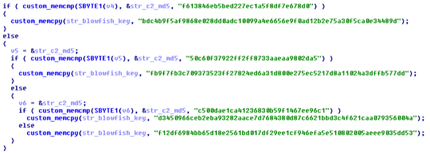 虽然APT10始终针对固定的地理位置和行业,但他们使用的恶意软件不断发生变化。在较新版本的UPPERCUT中,后门初始化Blowfish加密密钥的方式发生了重大变化,这使得分析师更难以检测和解密后门的网络通信。这表明APT10非常能够维护和更新其恶意软件。