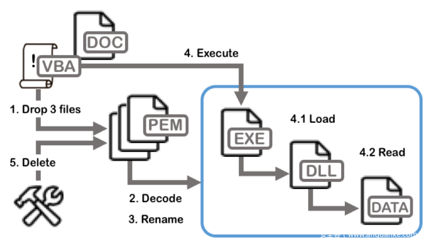 5.宏使用Windows esentutl.exe删除最初删除的.txt文件,并将文档文本更改为嵌入消息。完整的攻击概述如下图所示。一些攻击者会利用Windows certutil.exe(https://www.fireeye.com/blog/threat-research/2017/12/targeted-attack-in-middle-east-by-apt34.html )进行有效负载解码(https://securelist.com/apt-trends-report-q2-2017/79332/ ),而APT10(https://www.pwc.co.uk/cyber-security/pdf/cloud-hopper-annex-b-final.pdf )继续采用这种技术。