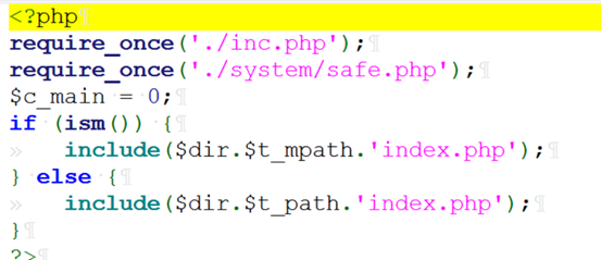 这里有个自定义函数ism() 查看了一下,实际上是返回一个false,那么这里就是包含了$dir.$t_path.index.php