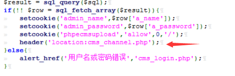 登陆后会设置cookie,然后跳转到cms_channel.php文件