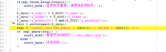 利用arrtoinsert这个自定义函数将$_data 这个数组进行处理,将数组转换为insert语句的字符串。前台留言似乎前台看不到,数据库f_ok来决定是否在前台展示。