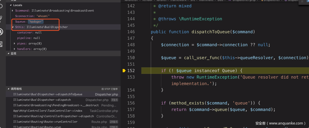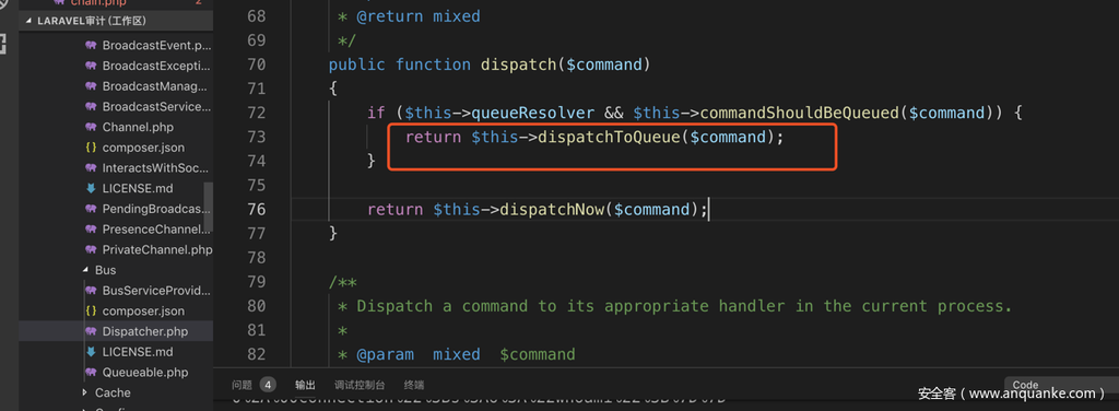 这次全局搜索哪些类存在dispatch函数,正好dispatcher本身中就存在,而且调用到了漏洞触发函数dispatchToQueue去执行call_user_func