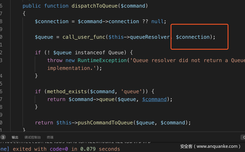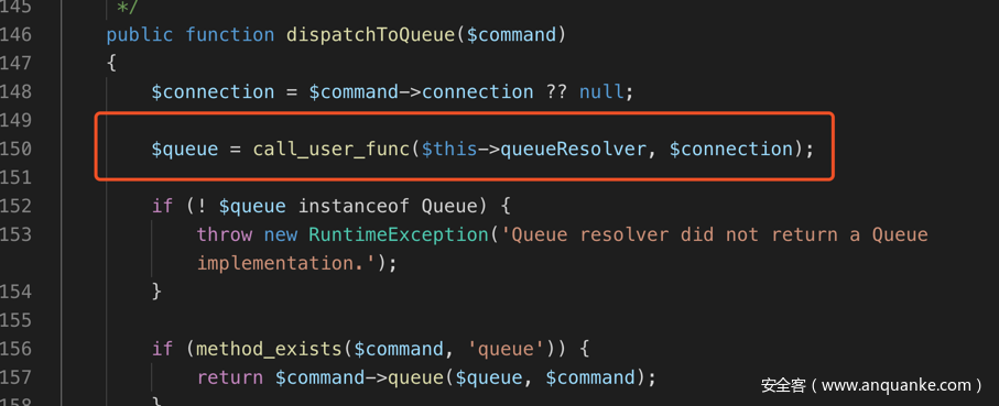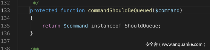 跟进commandShouldBeQueued发现command参数必须是继承自 ShouldQueue接口的对象才能进入判断,这点我们可以通过序列化控制$command为对象。