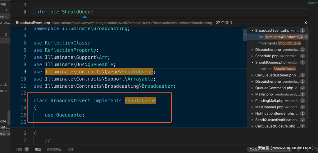 只需要全局搜一下哪个类实现了ShouldQueue接口,这里使用BroadcastEvent