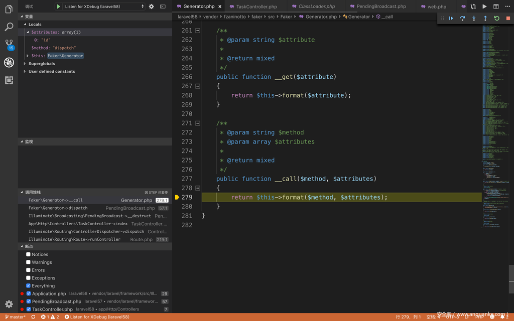步入执行dispatch函数,跳转到vendor/fzaninotto/faker/src/Faker/Generator.php的call方法