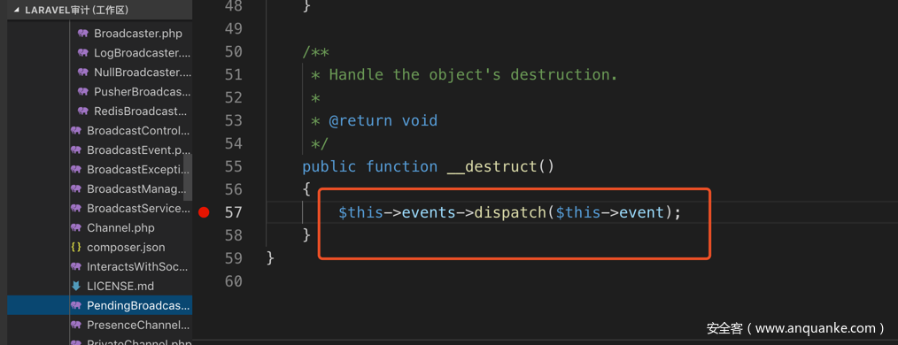 接着我们从源头追pop。入口方法依然在vendor/laravel/framework/src/Illuminate/Broadcasting/PendingBroadcast.php中,__destrcut执行dispatch函数