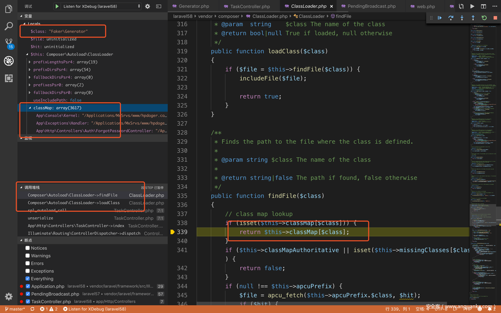 因此步入ComposerAutoloadClassLoader查找相应class对应于vendor中的php文件。也就是上文提到的laravel在加载服务容器时会执行的autoload_class作用结果