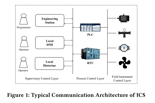 典型的ICS系统由三层,分别是(1)Field Instrument Control Layer,由传感器(senior)和执行器(actuator)构成,用来进行系统的输入和输出(2)Process Control Layer,由专用嵌入式设备组成,比如PLC/RTU,用来控制实时进程(3)Supervisory Control Layer,由几个工作站组成,用来提供实时监控以及控制系统的设备。
