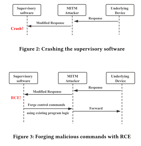 主要通过两种方式,一种是修改报文,使得Supervisory software 崩溃,另一种是利用Supervisory software已有逻辑执行恶意命令。