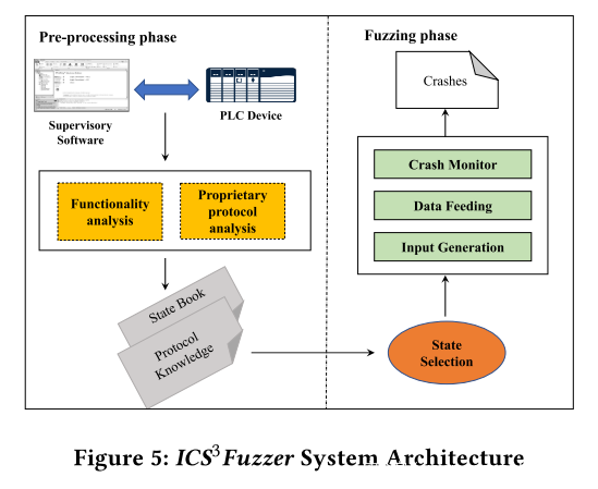 ICS3Fuzzer的结构如下图所示,主要分为两部分Pre-processing phase和Fuzzing phase: