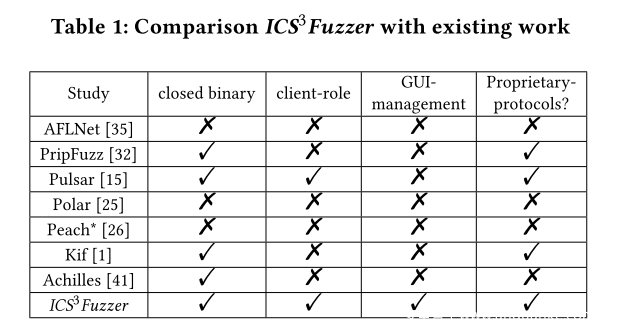 现有fuzzing工作与ICS3fuzzer特性对比图
