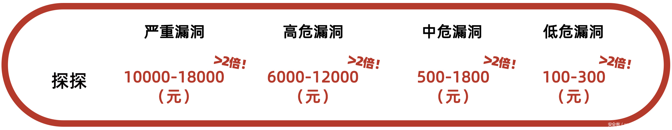 2.8-2.18期间,探探相关有效漏洞&情报最高奖励18000元。比以往的双倍奖励还更高更给力,部分奖励甚至超3倍!