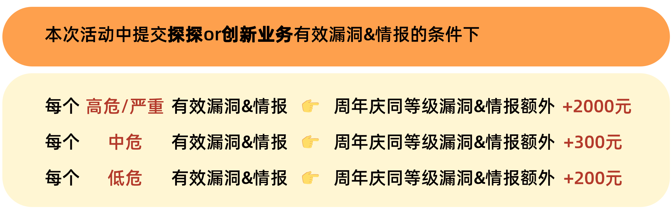 2.8-2.18期间,提交探探OR创新业务相关有效漏洞&情报,即可获得陌陌SRC(一年一度奖励最高、礼品最丰富的)周年庆活动额外奖励加成卡,可以在周年庆活动中使用使奖励+++!咱就是说,本就超高奖励的周年庆活动再加上如此额外加成,小编想都不敢想啊!