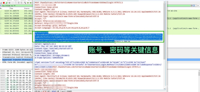 下面是内网监听攻击中截获的流量数据,可以看到体验者输入的账号密码等关键信息,其中的加密部分也可以通过MD5解码破译,得到明文数据,造成的隐私泄露危害极大。