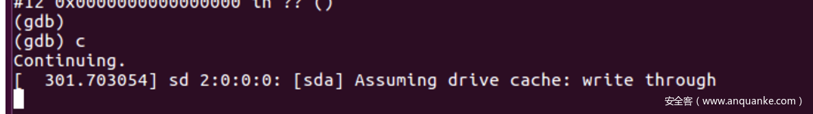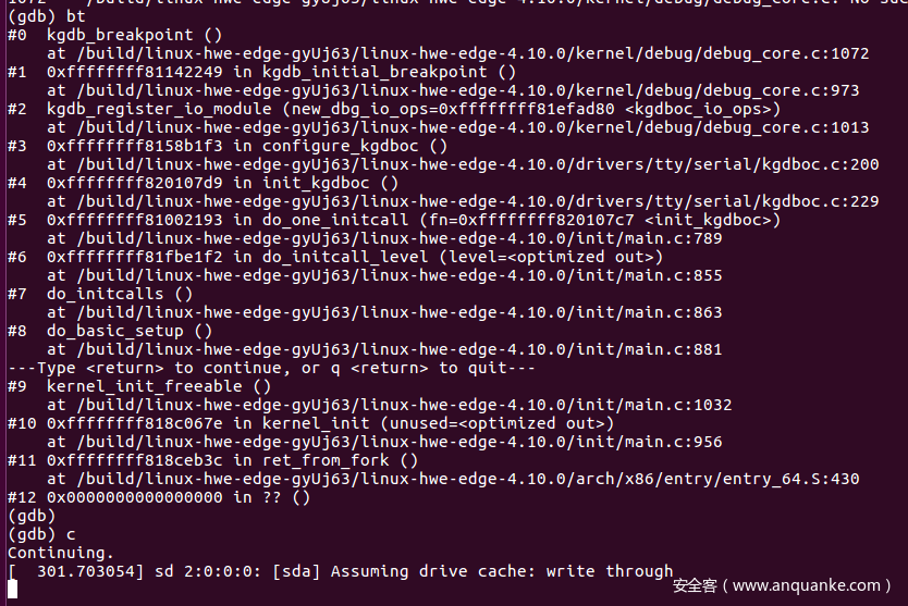 符号加载完成,bt查看当前栈帧,c运行内核。