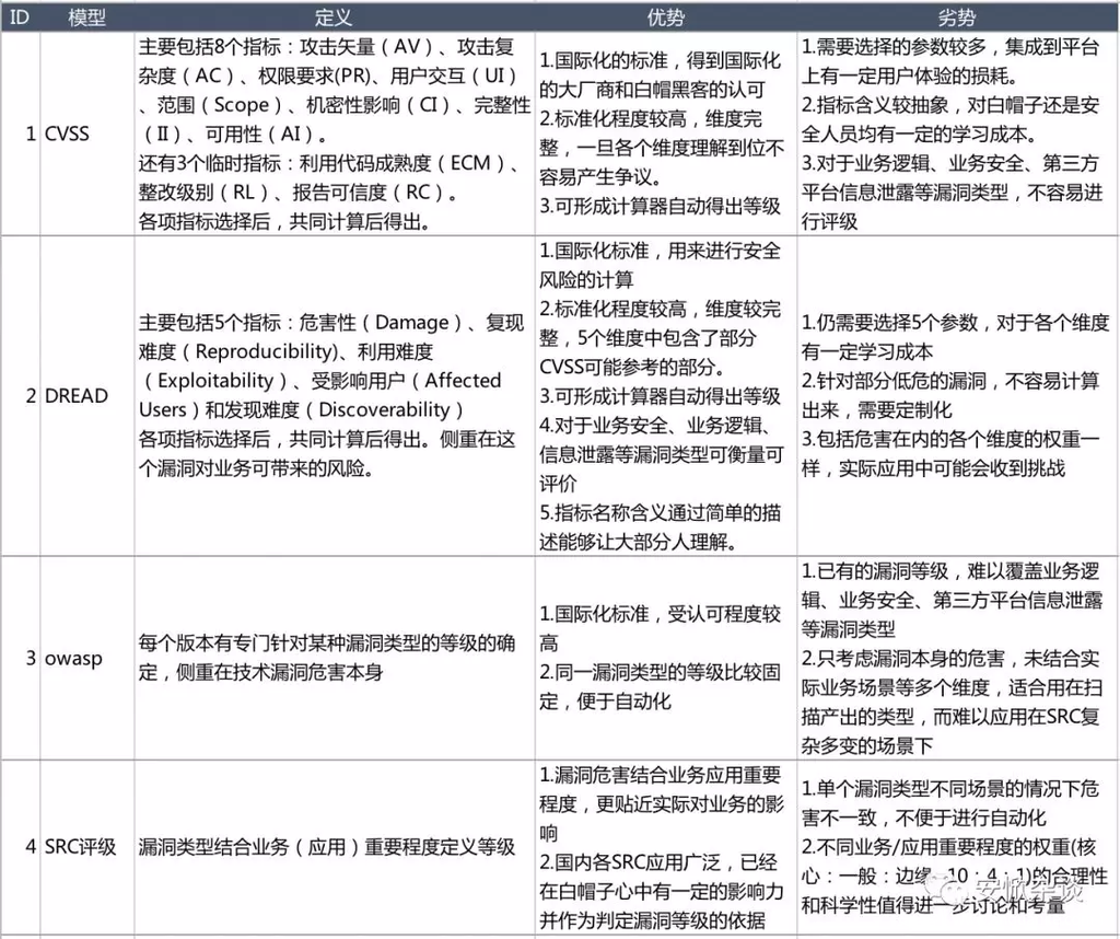 如前文所述,已知的漏洞计算模型包括cvss,dread,owasp,还有各大src现在应用的方式,真正准备进行标准化前针对各个模型进行了初步的调研。