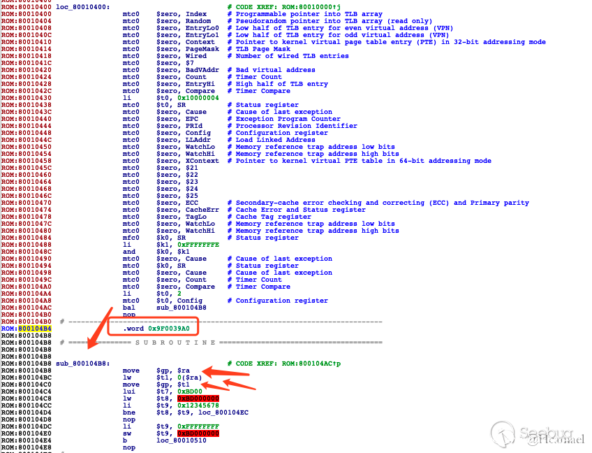 跳转到0x80010400, 随后是一段初始化代码,下一步我们需要确定程序基地址,因为是mips,所以我们可以根据$gp来判断基地址。