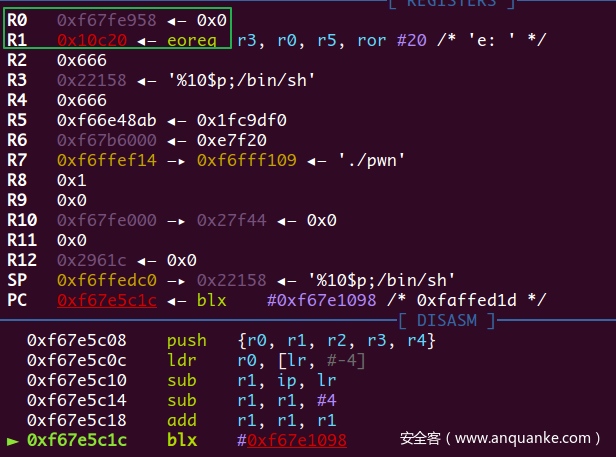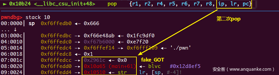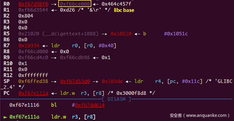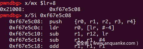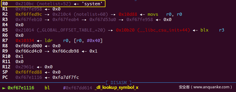 在PLT表开头处的几条指令,lr寄存器指向了GOT表(在pwndbg中REGISTERS栏没有显示lr寄存器,不过可以用p/x $lr来查看),下一条跳转指令pc = *(lr + 8)也就是跳去GOT表上存的一个地址,也就是_dl_runtime_resolve,注意这里的跳转指令也带有!,所以lr变成了GOT+8