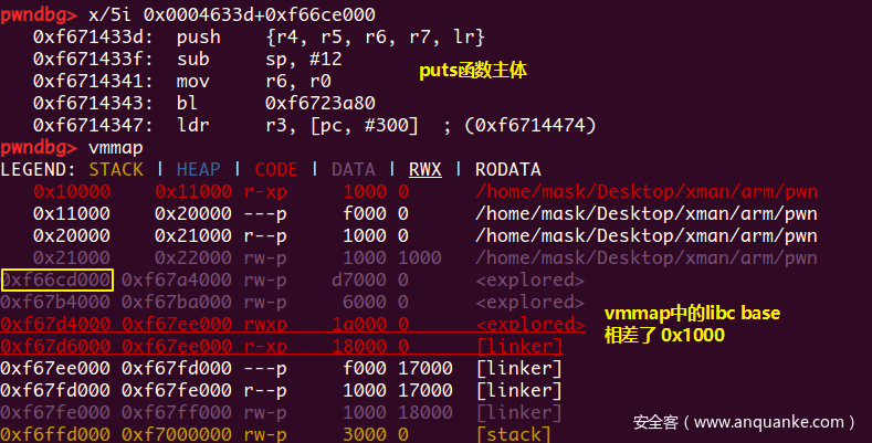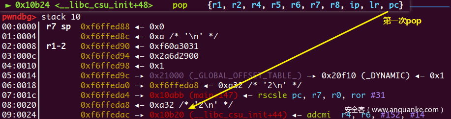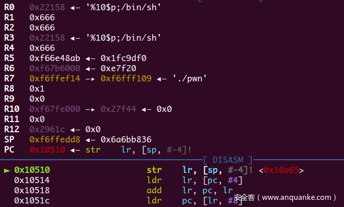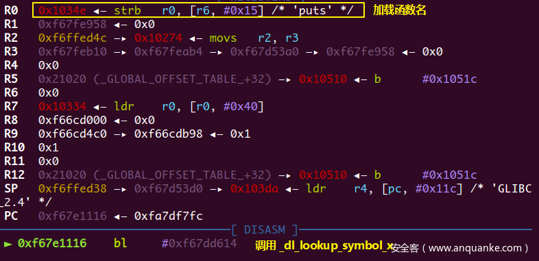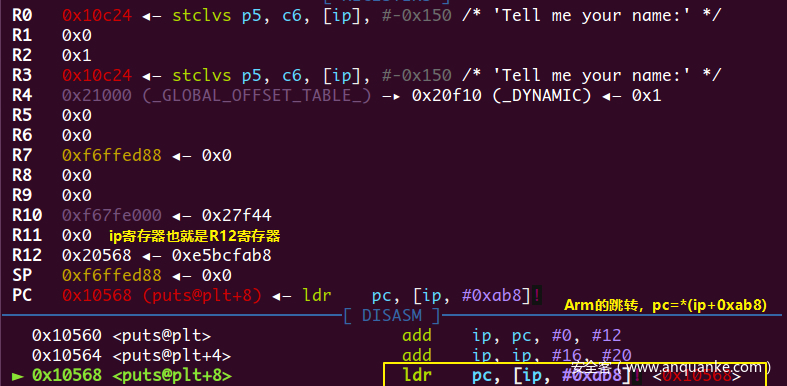 这里的ldr pc,[ip, #0xab8]!(注意有一个!)的意思是ip = ip + 0xab8, pc = *ip,此时ip寄存器指向了puts@got,然后pc读取puts@got的值,与x86架构一样,未加载的函数其GOT表上填的都是跳去dl_resolve的函数地址,也就是PLT表头的位置,于是程序就到了准备进入dl_resolve的地方0x10510位置处
