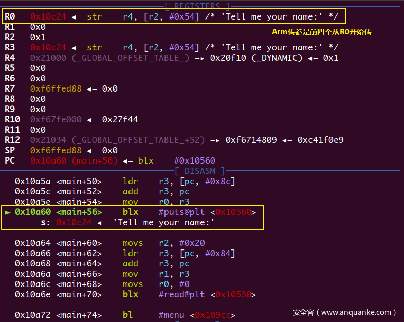 .text:00010A5C ADD R3, PC ; "Tell me your name:"
