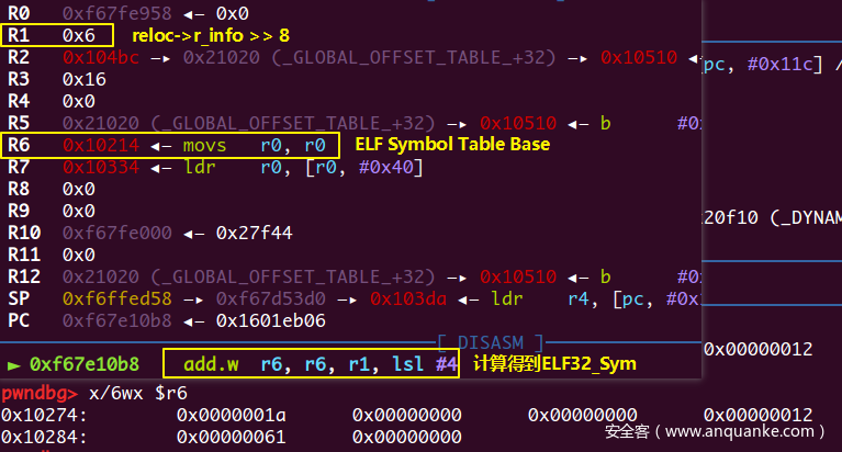 lr寄存器(此时是指向GOT+8)取得link_map的地址(保存在GOT+4),作为参数1,存在r0 - 计算函数的