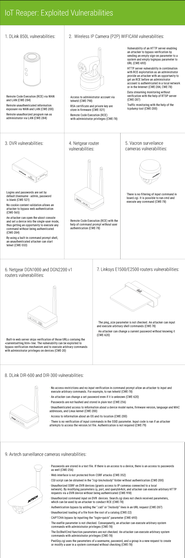 可能很多人都知道,Mirai在感染目标设备时利用的是安全漏洞以及弱密码。而Reaper饥渴难耐的“大刀”则更加锋利,因为Reaper僵尸网络可以利用多款物联网设备中的数十种安全漏洞,其中受影响的产品包括D-Link、Wi-Fi CAM、JAWS、Netgear、Linksys和AVTECH等厂商旗下的路由器和摄像头。而且随着时间的推移,这把“大刀”也变得更加锋利了:由于目标物联网设备长期不更新,该僵尸网络的规模也正在急速扩张。