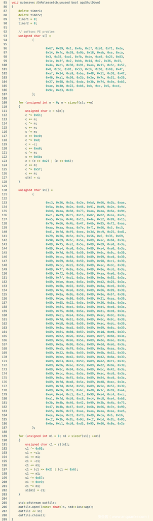 这里的第一道题目形式较为简单,思路非常经典。恶意代码存在于Code::Blocks的一款官方插件autosave中,题目部分代码如下: