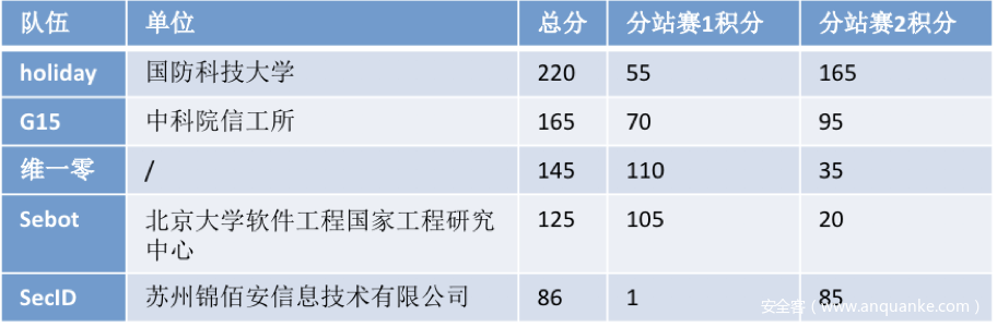 本赛季两轮比赛之间没有难度区分,因此不设定分数权重。题目数量,两轮分别为44/46道,按每题得分10分、每个错误答案扣5分计,因此赛季满分900分。最终本赛季有效参与队伍9支,其中前列队伍排名与分数如下: