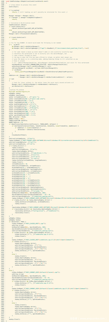 第二道针对Code::Blocks的题目,我们选择了一道设计完善、链路复杂且具有隐蔽性的题目,其恶意代码直接植入到了codeblocks.exe主程序文件中,CodeBlocksApp::OnAppActivate函数内容。该部分原始题目代码如下: