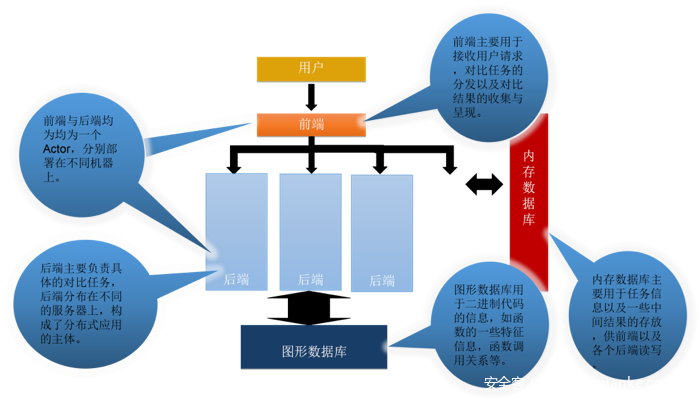 系统结构如下图所示。系统分为前端、后端、图数据库三部分。前端用于接受比对文件,利用IDA提取二进制文件的函数粒度的特征。后端分布并行化运行多个分析进程,对输入文件进行函数粒度的相似度比较。图数据主要用于对二进制文件特征的保存。