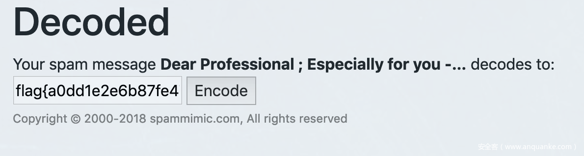 根据题目描述信息,google一下”垃圾邮件+栅格密码”,得到解密网站http://www.spammimic.com/decode.shtml进行解密得到