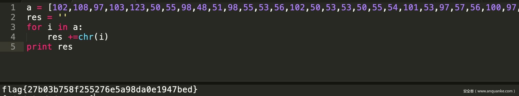 a = [102,108,97,103,123,50,55,98,48,51,98,55,53,56,102,50,53,53,50,55,54,101,53,97,57,56,100,97,48,101,49,57,52,55,98,101,100,125]