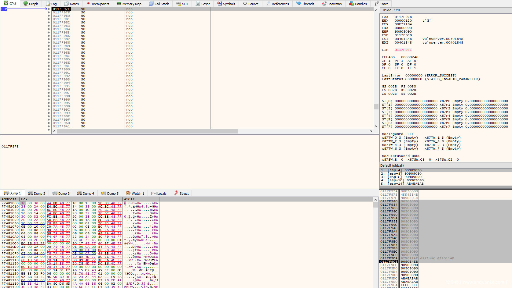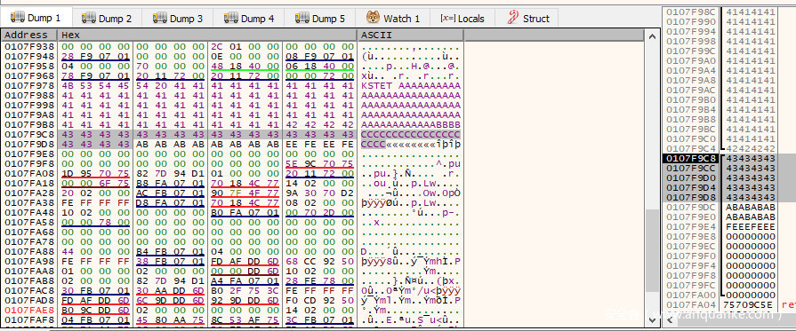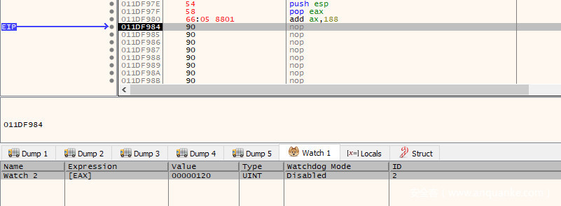 在该指令上方,是一个mov操作,它将$ebp-420(即栈基址下方的0x420字节的位置)中的值移动到$eax。此时,$ebp-420的值为0x011DFB50。继续执行程序,直到程序遇到在NOP块底的断点。在dump选项卡或堆栈视图中跟随此地址,我们可以看到该值仍然存在。