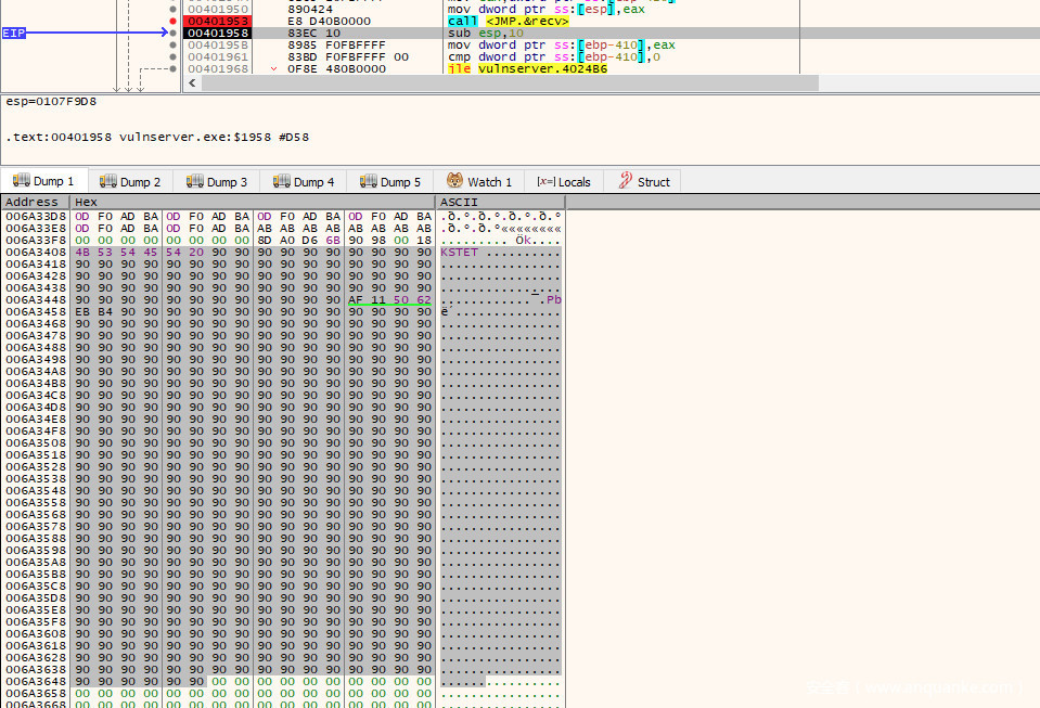 为了方便演示,我发送了1024个x41的payload,以验证exp是否按预期工作。我们重新启动vulnserver.exe并单步跳转到stager代码中recv调用处,可以看到程序接收到1024字节的0x41并放置了在随后将执行的位置(NOP指令的末尾):