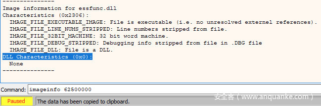 在内存映射选项卡中能够看到这个dll的基址(在本例中是0x62500000),我们就可以在日志选项卡(Log)中运行命令:imageinfo 62500000,在DLL的PE头中检索信息。可以看到DLL Characteristics标志设置为0,这意味着程序没有启用ASLR或DEP保护。
