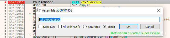 在继续之前,需要双击调用指令并记下recv的地址,用于接下来的工作,如下图所示,recv函数的地址为0x0040252C:
